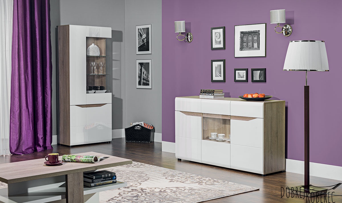 Moderní a elegantní nábytek v kombinaci dubu sonoma a bílé barvy. Na první pohled zaujmou hlavně originálně řešené úchytky. Celý systém disponuje také systémem tichého dovírání dvířek a zásuvek (SOFT CLOSE). Korpusy jsou vyrobeny z kvalitní laminové desky a fronty z MDF s bílou fólií.
